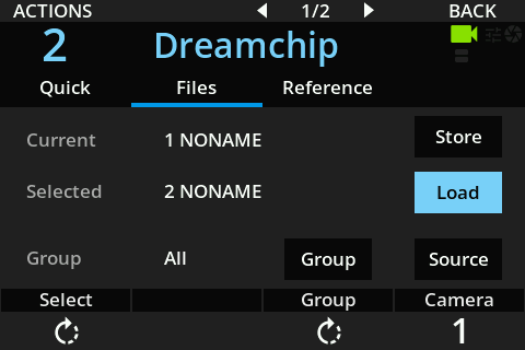 Current= The scene file which is loaded for this cameraSelected= The scene file slot which you canStoreorLoadfromStore= Save or 'Store' the camera configuration into a scene fileLoad= Load a certain scene file onto cameraSource= This details which camera you want to load from - This is used when transferring a scene file from one camera to another