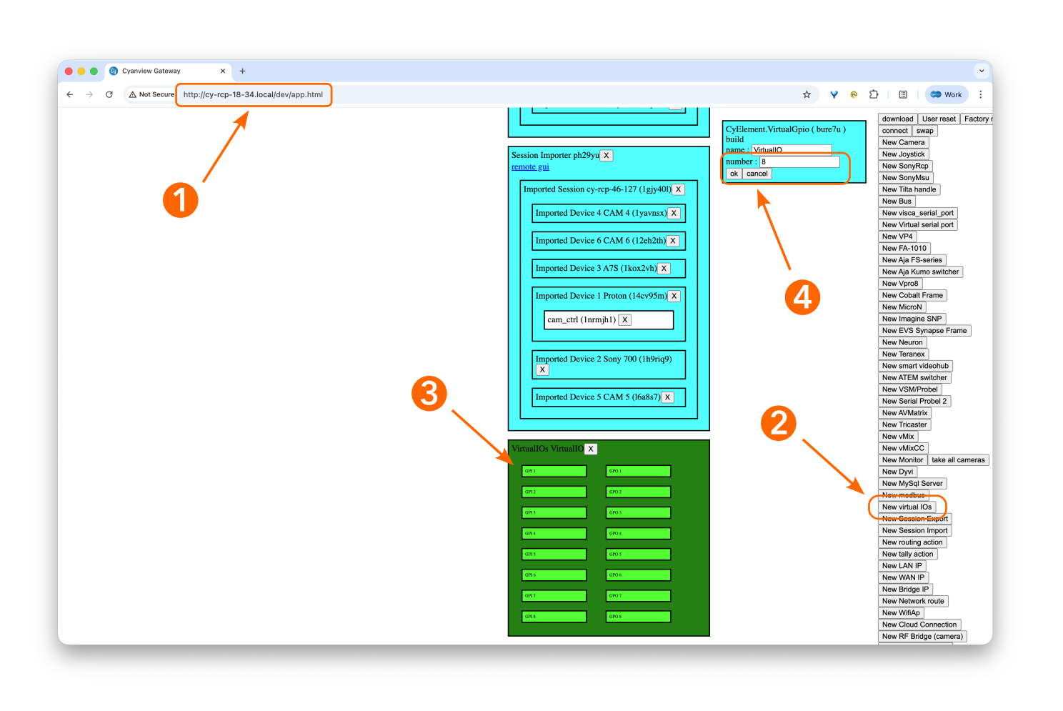 /dev/app.htmlto the URL to access the developer view. - Click on New Virtual IOs to create the virtual GPIOs on Ember+. A new block will appear at the very bottom of the page.